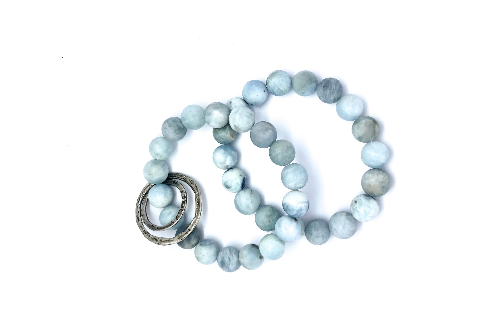 This aquamarine beaded bracelet set features beautiful blue extra large smooth 10mm aquamarine beads. These are stretch beaded bracelets with two hammered sterling silver charms on one bracelet while the other is plain with the light blue aquamarine beads. The two infinity loop shaped silver circle charms are looped over the beads for a more chic appearance. These light blue aquamarine bracelets pair very well with the signature sterling silver beaded bracelets.