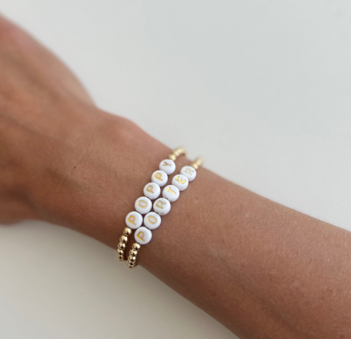 - White Plastic Beads with Gold Lettering