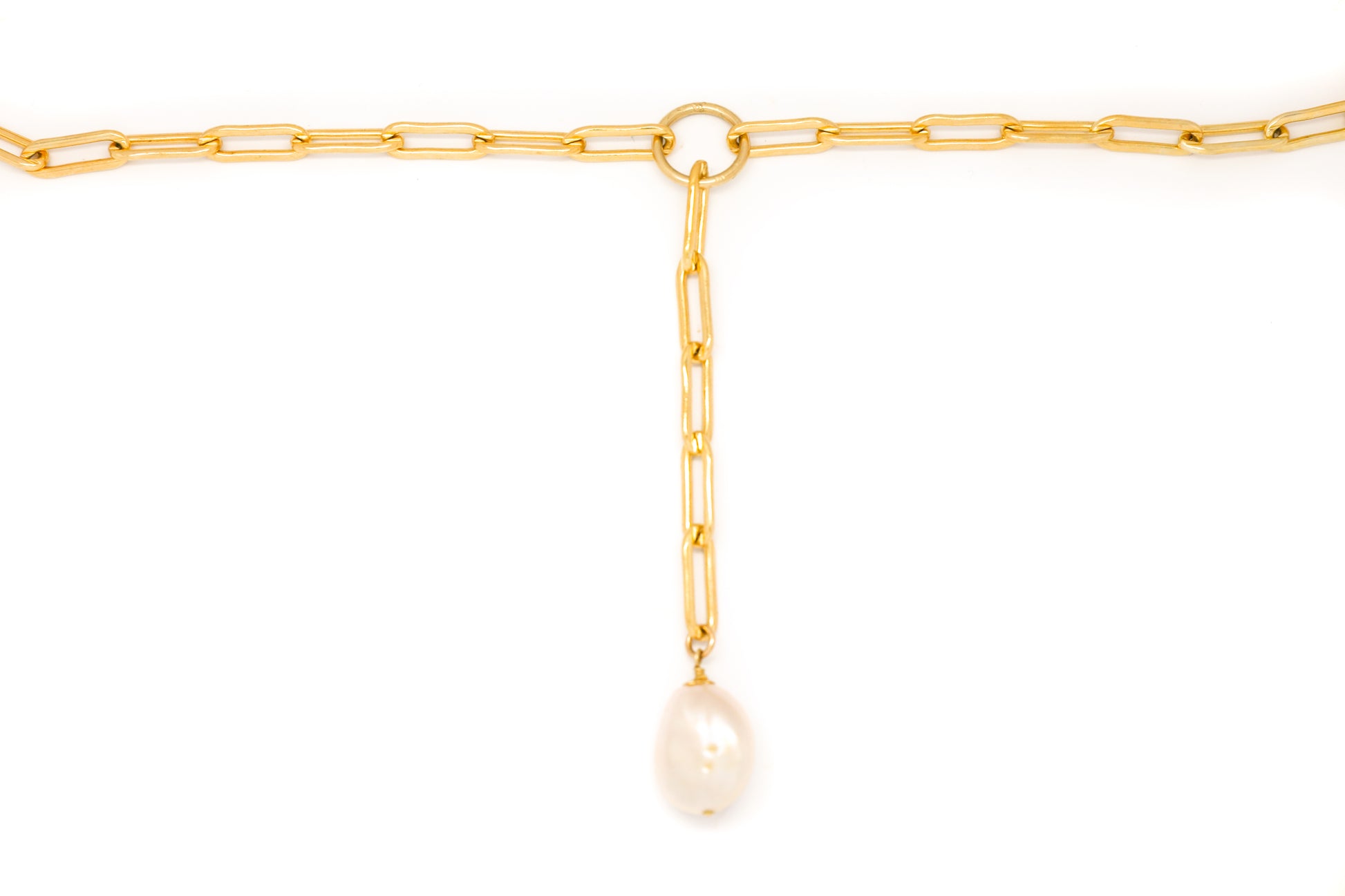 Medium Gold Oval Link Chain Lariat Necklace + White Freshwater Pearl