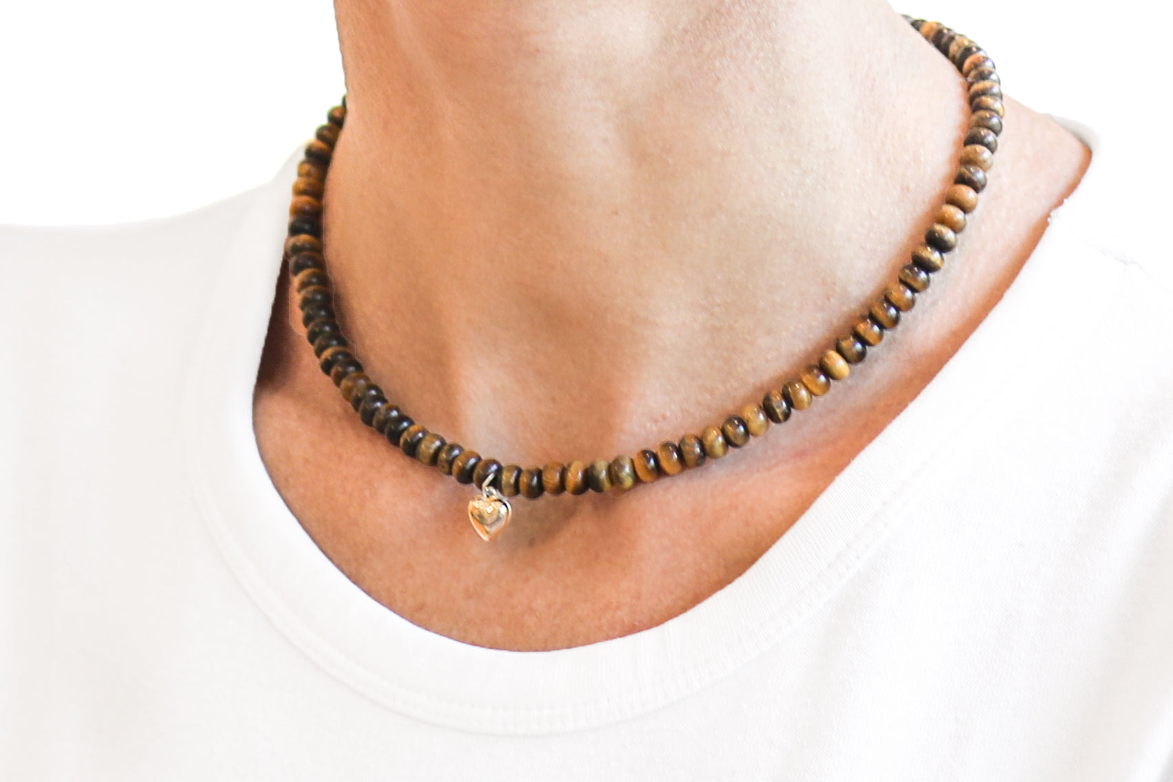 Tiger's Eye Beaded Necklace with Gold Heart Charm